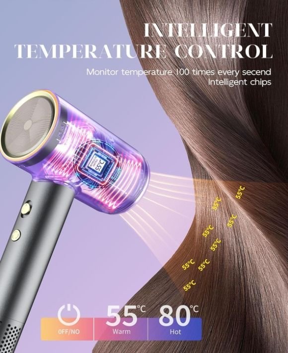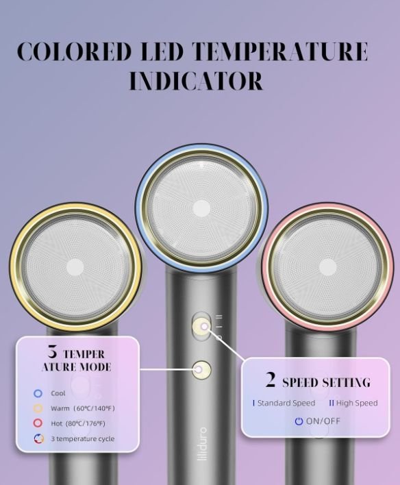 INTELLIGENT TEMPERATURE CONTROL - LILIDURO blow dryer temperature control chip with monitoring technology at a rate of 100 times per second, ensure stable and even airflow temperature that won't damage the hair; 3 heat settings + heat cycle setting, meet your various needs;