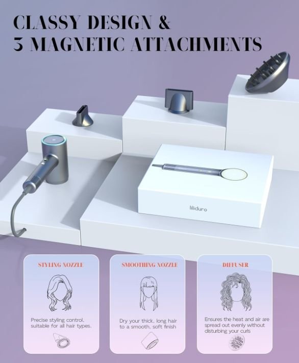 COMPACT & LIGHTWEIGHT & MAGNETIC ATTACHMENTS -The High-Speed hair dryer is half the weight and size of traditional blow dryer; This reduce strain on your arm while allowing for more precise styling movements; Perfect choice as a travel hair dryer; Coming with 3 magnetic attachments, Diffuser & Concentrator nozzle & Styling nozzle for various styling;