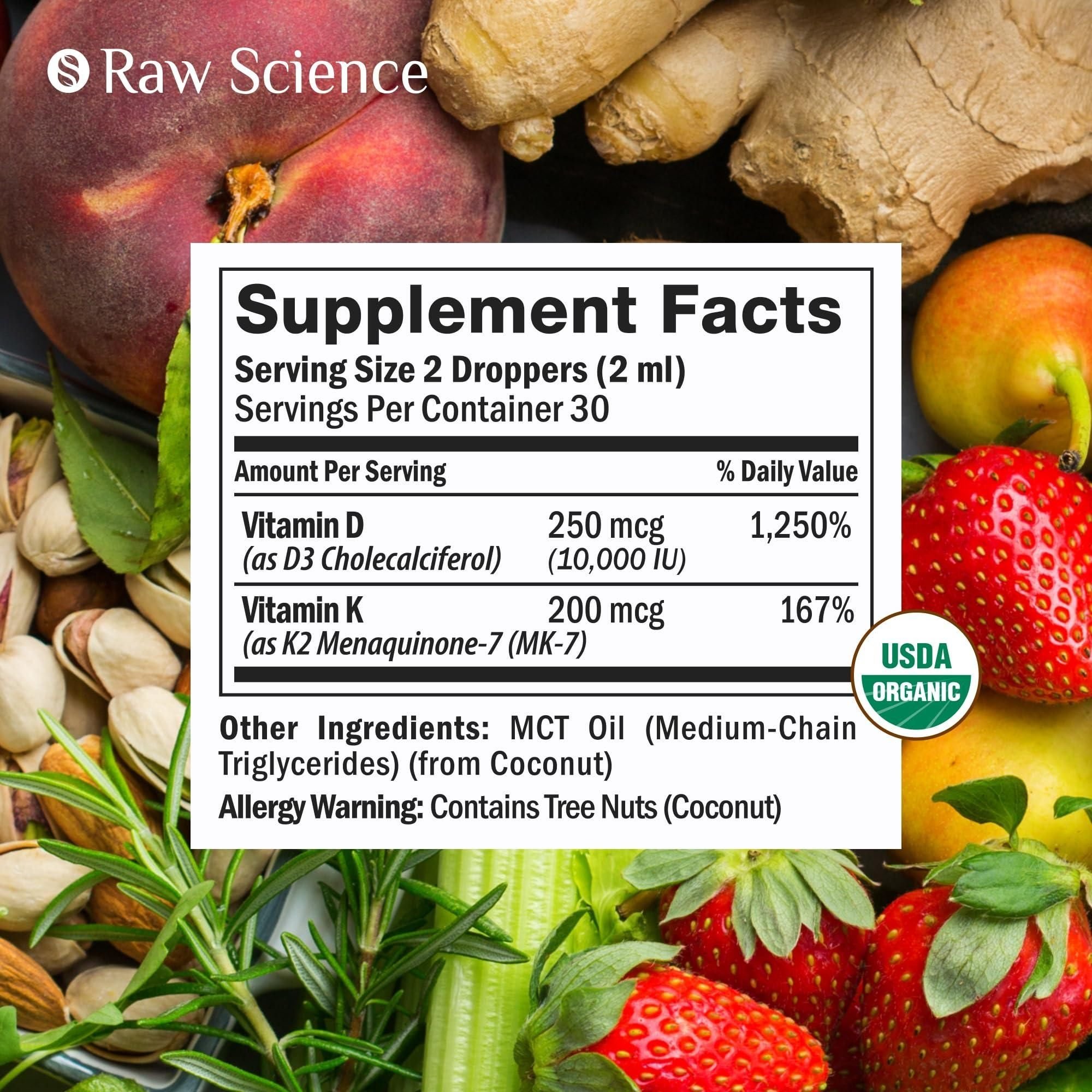 2.things more important than your heart, which is why our cardiovascular supplement is designed to support you in your heart wellness journey while also strengthening bones & joints! every serving contains vitamin d3 10000 iu and 200 mg of k2 vitamin supplement mk-7 for optimal benefits. liquid vitamin d3 with k2 drops for adults: your health is everything, and we know it. thats why we crafted this highly bioavailable, non-gmo k2 d3 vitamin supplement liquid formula, also known as vit k2