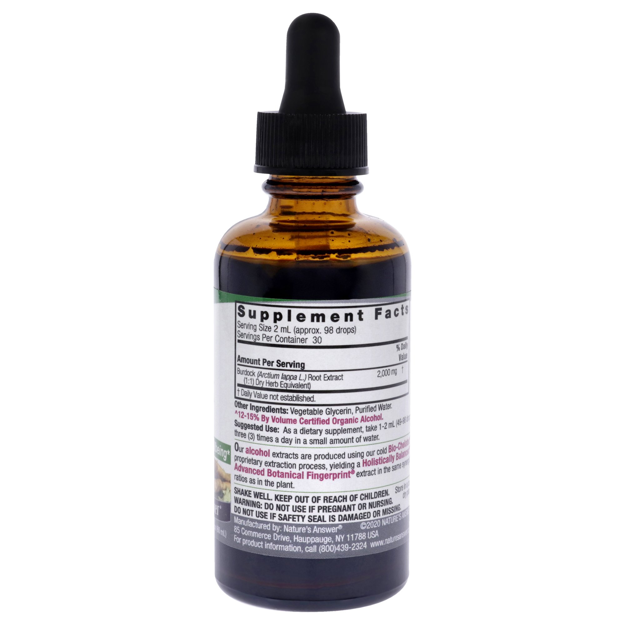 Nature�s Answer super concentrated Burdock Root extract is made from 2,000 mg of Mother Nature�s Burdock Root and promotes overall good health and well-being. Nature's Answer Burdock Root is Made from 1,360 mg of Pure Burdock Root Extract per serving. Not to be confused with less potent Tinctures.