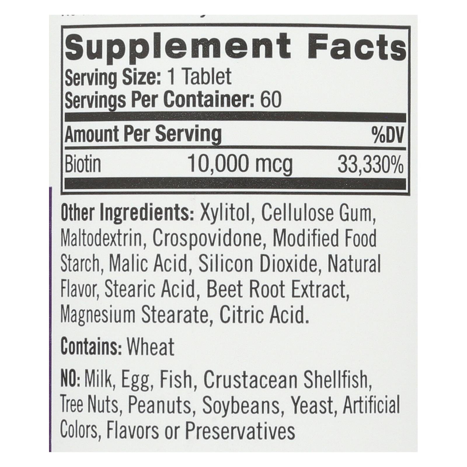 Natrol biotin description: maximum strength promotes healthy hair and strong nails supports cellular energy production biotin is an important b-vitamin that provides dietary support for healthy hair and nails as well as energy production. By supporting the matrix of hair and nails, biotin promotes shiny, lustrous hair and strong, resilient nails. Free of yeast, but contains wheat, corn, milk, egg, soy, glutens, artificial colors and flavors, added sugar, starch and preservatives. Disclaimer these statements have not been evaluated by the fda. These products are not intended to diagnose, treat, cure, or prevent any disease.