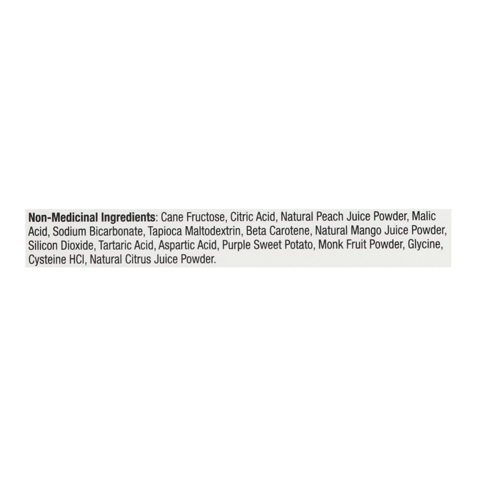 ingredients : cane fructose;citric acid;natural peach juice powder;malic acid;sodium bicarbonate;tapioca maltodextrin;beta carotene;natural mango juice powder;silicon dioxide;tartaric acid;aspartic acid;purple sweet potato;monk fruit powder;glycine;cysteine hcl;natural citrus juice powder
