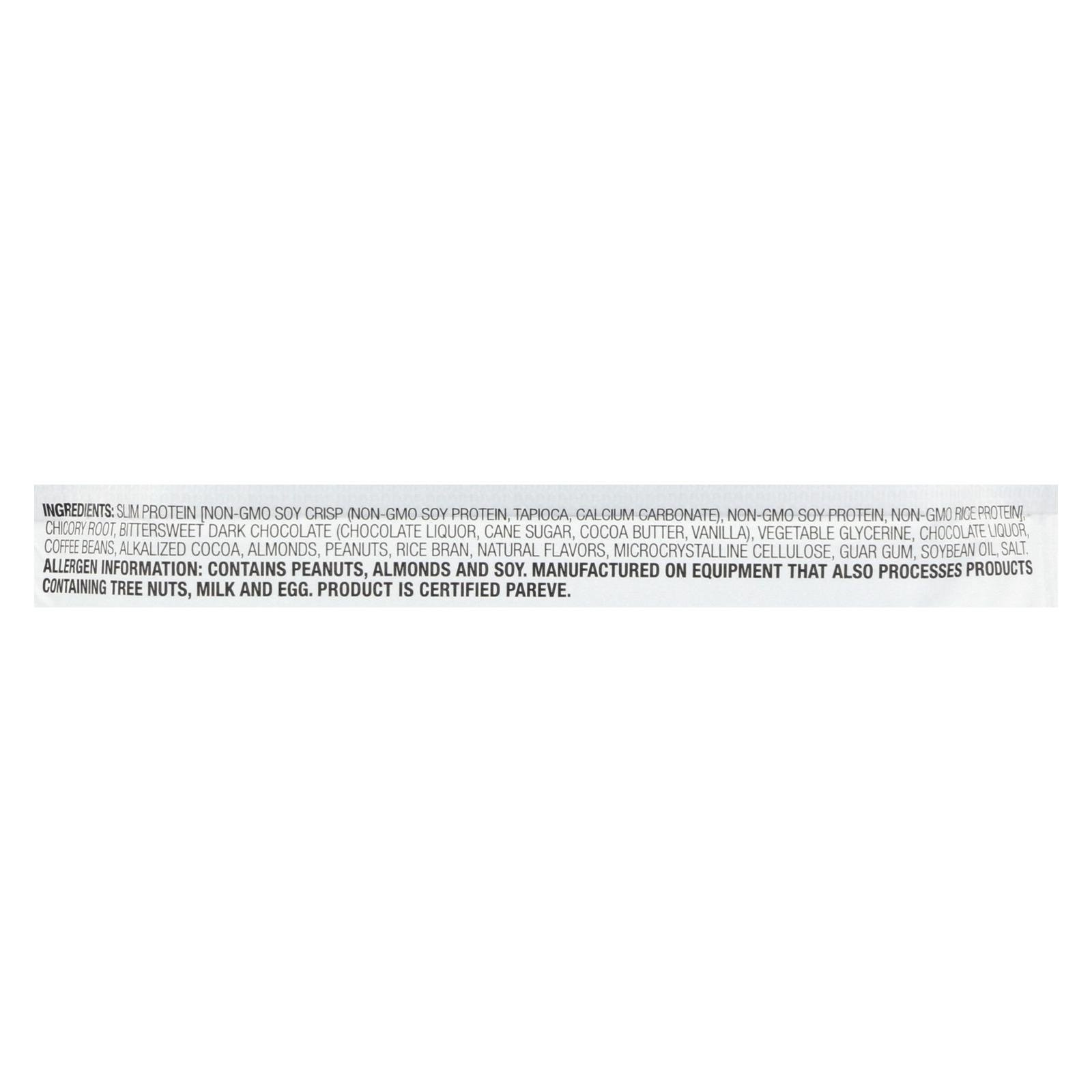 ingredients : slim protein [non-gmo soy crisp (non-gmo soy protein, tapioca, calcium carbonate), non-gmo soy protein, non-gmo rice protein];chicory root;bittersweet dark chocolate (chocolate liquor, cane sugar, cocoa butter, vanilla);vegetable glycerine;chocolate liquor;coffee beans;alkalized cocoa;almonds;peanuts;rice bran;natural flavors;microcrystalline cellulose;guar gum;soybean oil;salt