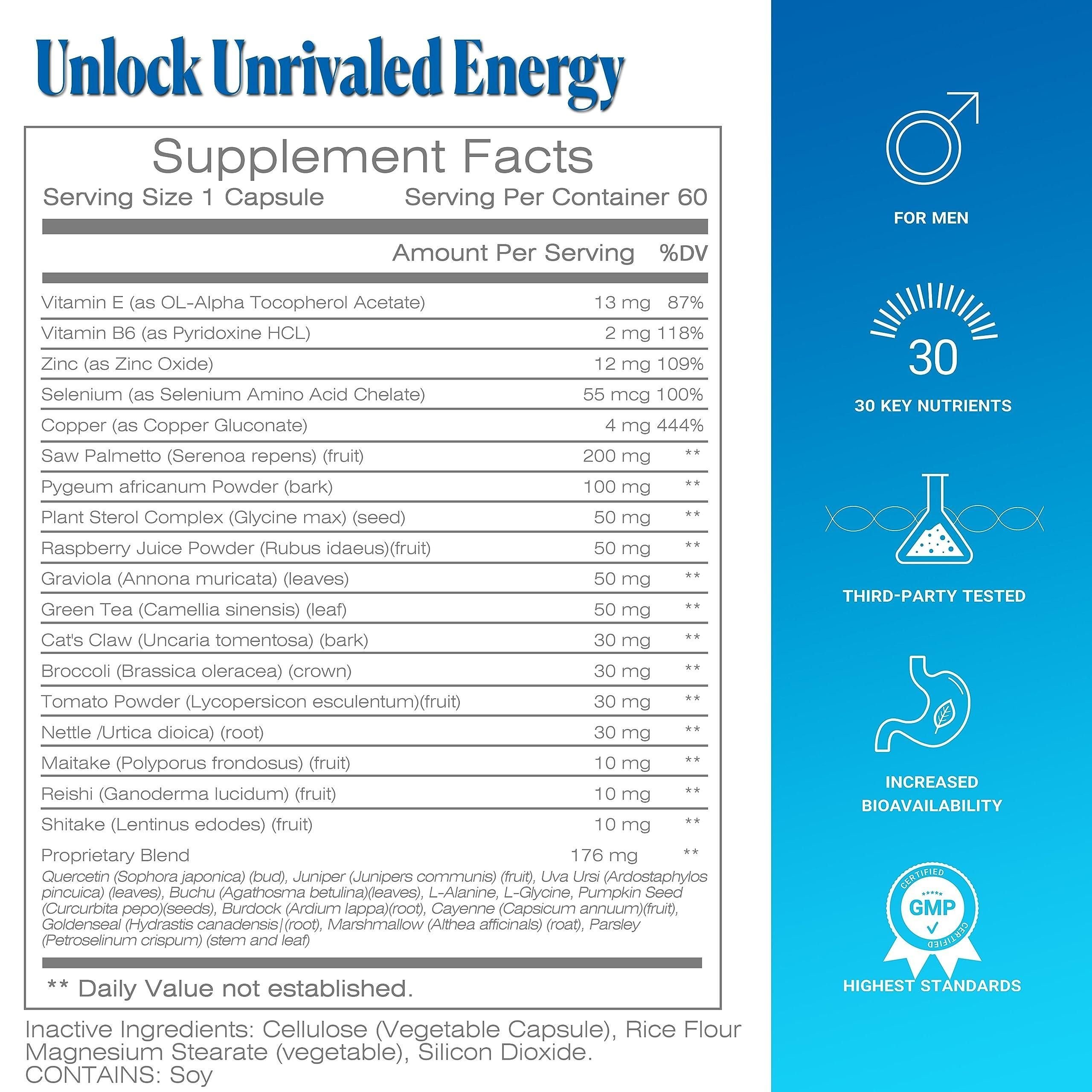 2.ingredients, amino acids, and vitamins work to increase energy and drive in your daily active life. add our prostate support supplement to your daily routine and notice the difference. most balanced formula - we've combined everything you need in one convenient prostate health supplement. graviola, saw palmetto berries, cat's claw, plant sterols, pygeum africanum, and zinc are all included in the quick-dissolving capsules.