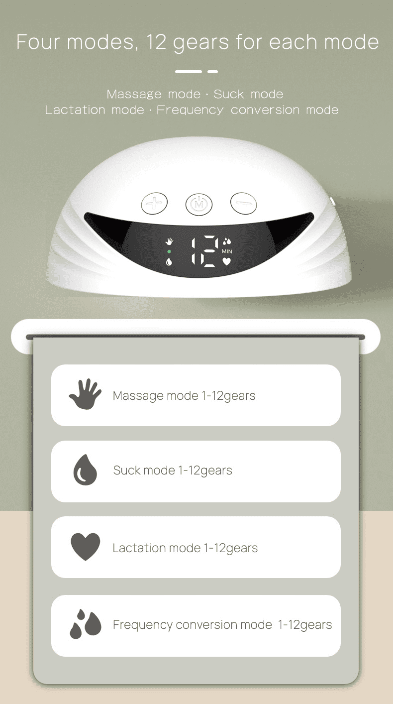 12 functions: on / off / mode selection button, gear mode +, frequency conversion mode, gear mode-, massage mode, time display, power indicator light, lactation mode, lactation mode, gear mode / timing display