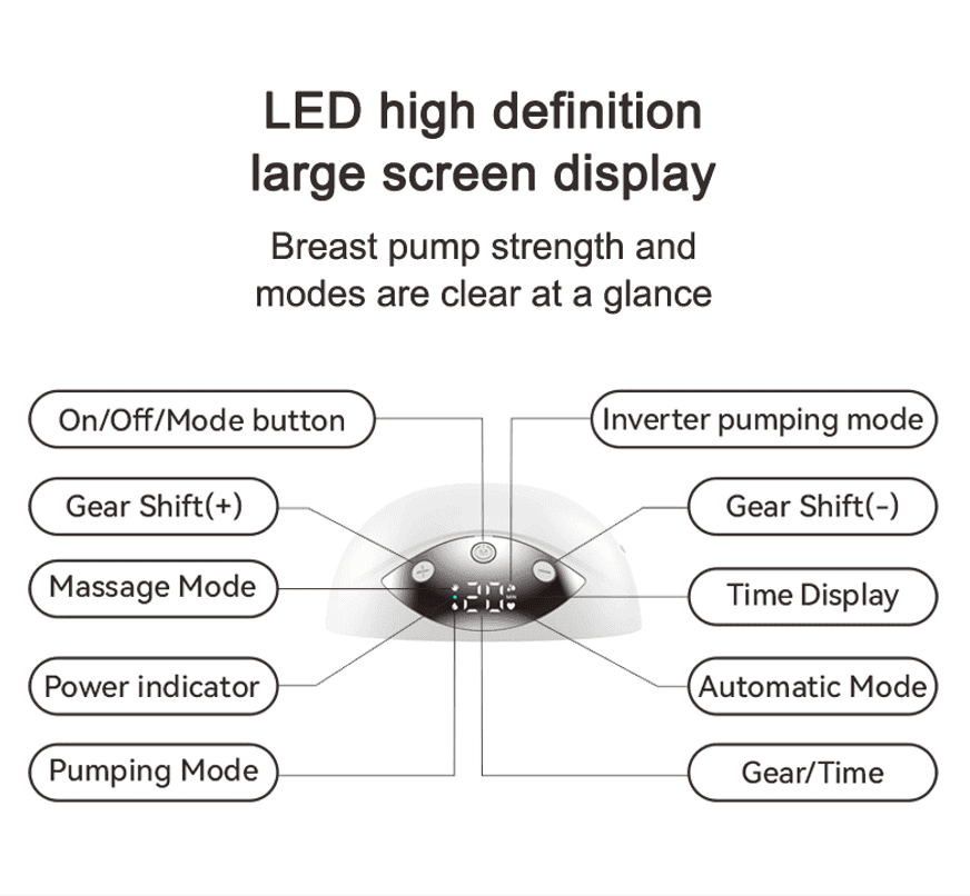 10 functions: frequency conversion mode, on / off / mode selection button, gear +, gear-, time display, power indicator light, milk absorption mode, massage mode, automatic mode, gear / timing display