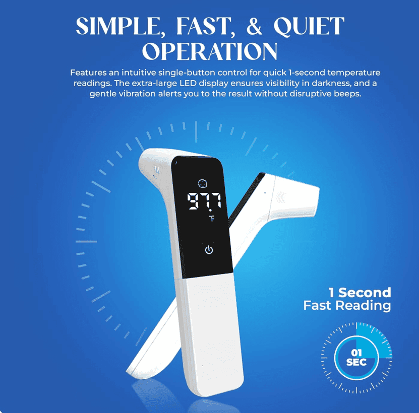 Simple, Fast, & Quiet Operation: Features an intuitive single-button control for quick 1-second temperature readings. The extra-large LED display ensures visibility in darkness, and a gentle vibration alerts you to the result without disruptive beeps.