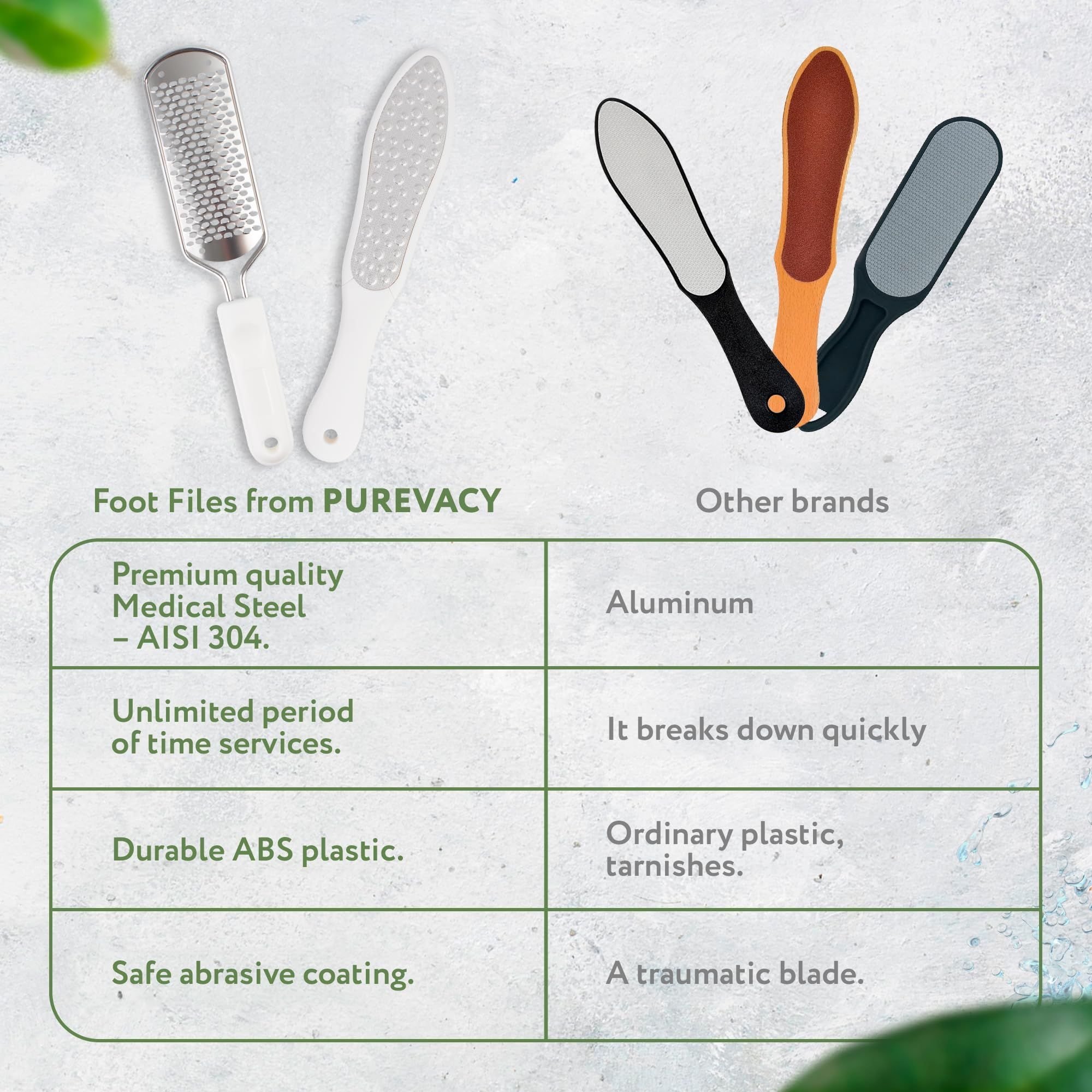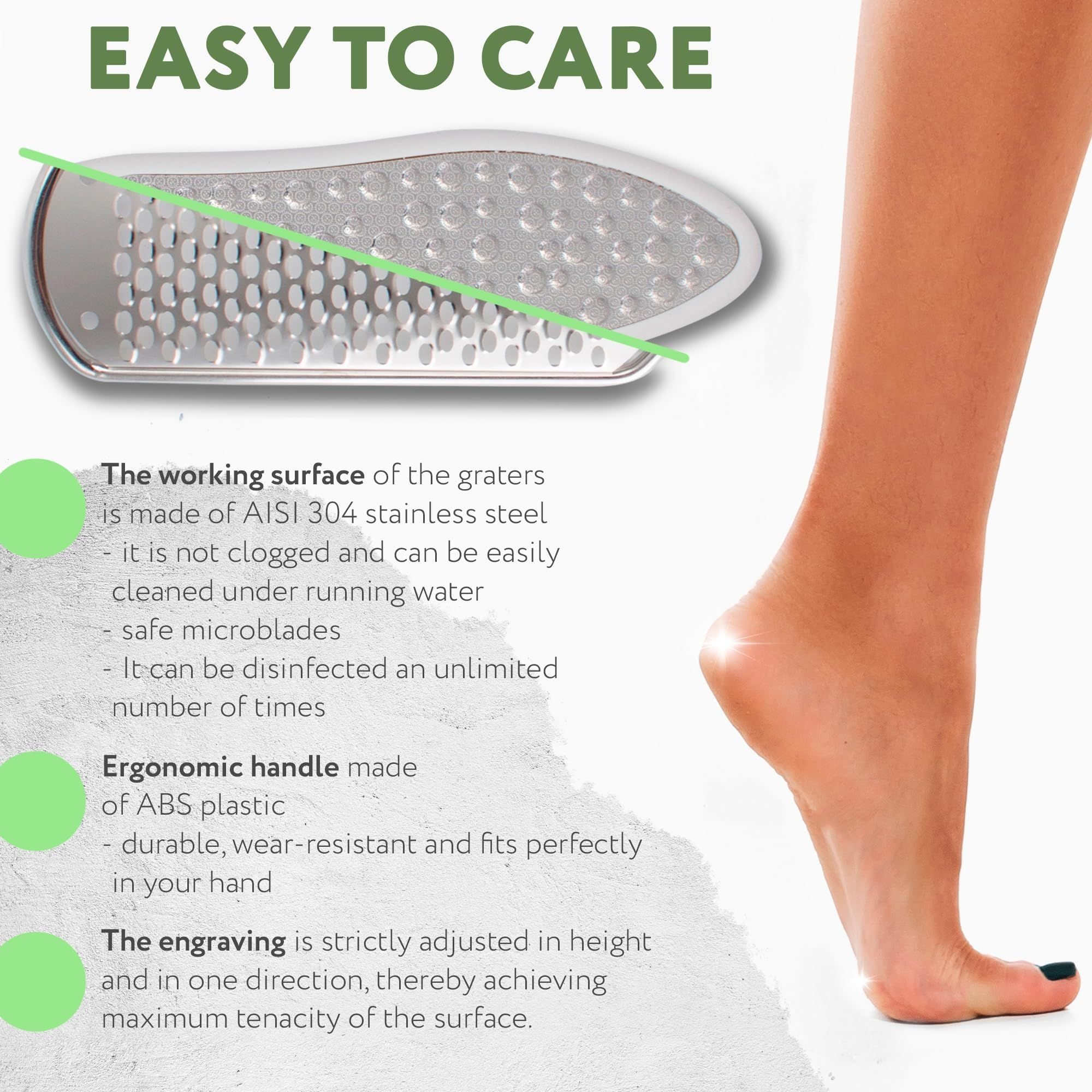 2.Exclusive Quality. Our foot scraper for callus removal and dry skin remover for feet are made of 304 grade stainless steel, so they will not rust. Dry skin pedicure file handle is made of ABS plastic and is more comfortable among other foot care products.