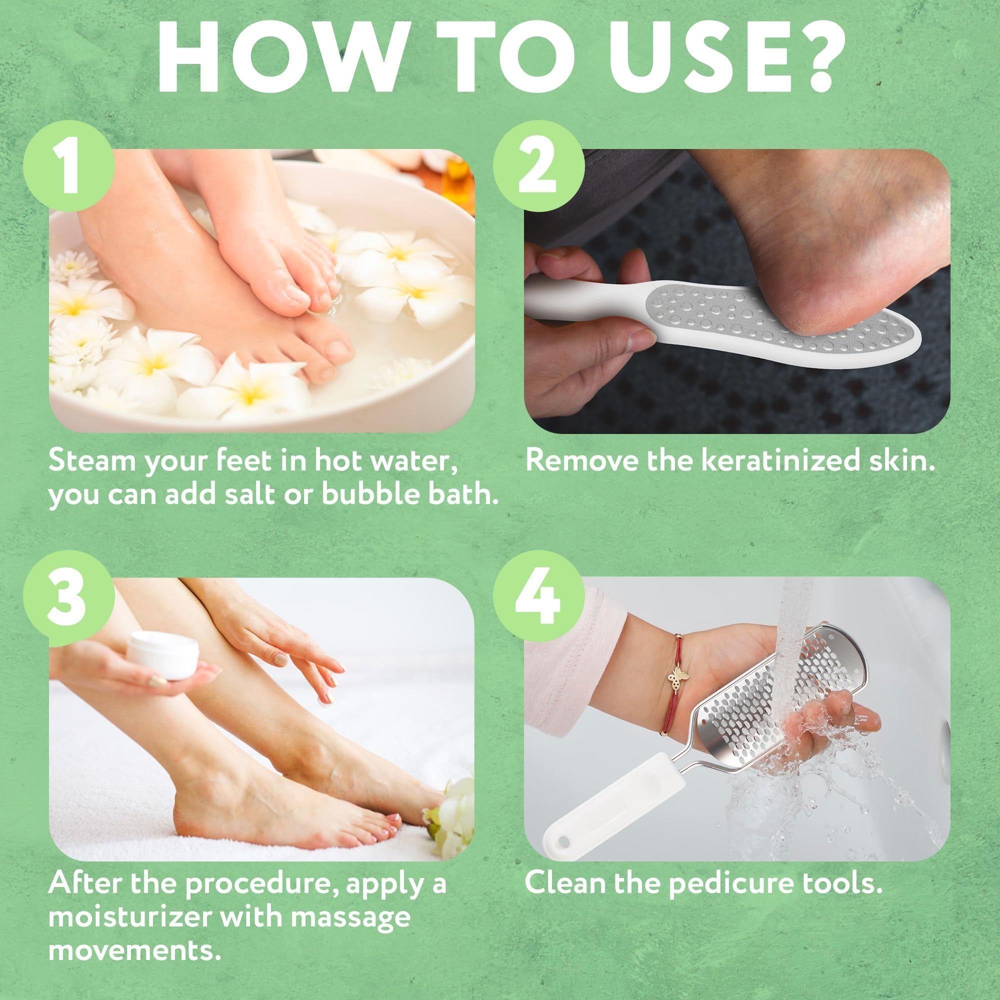 3.Three Easy Steps. First, use the foot rasp file to remove the top layer of dead or rough skin. After 1 step, use the coarse side of the 2-sided foot file to remove rough skin. Then use the fine side to buff feet. Finally, enjoy baby skin on your feet.